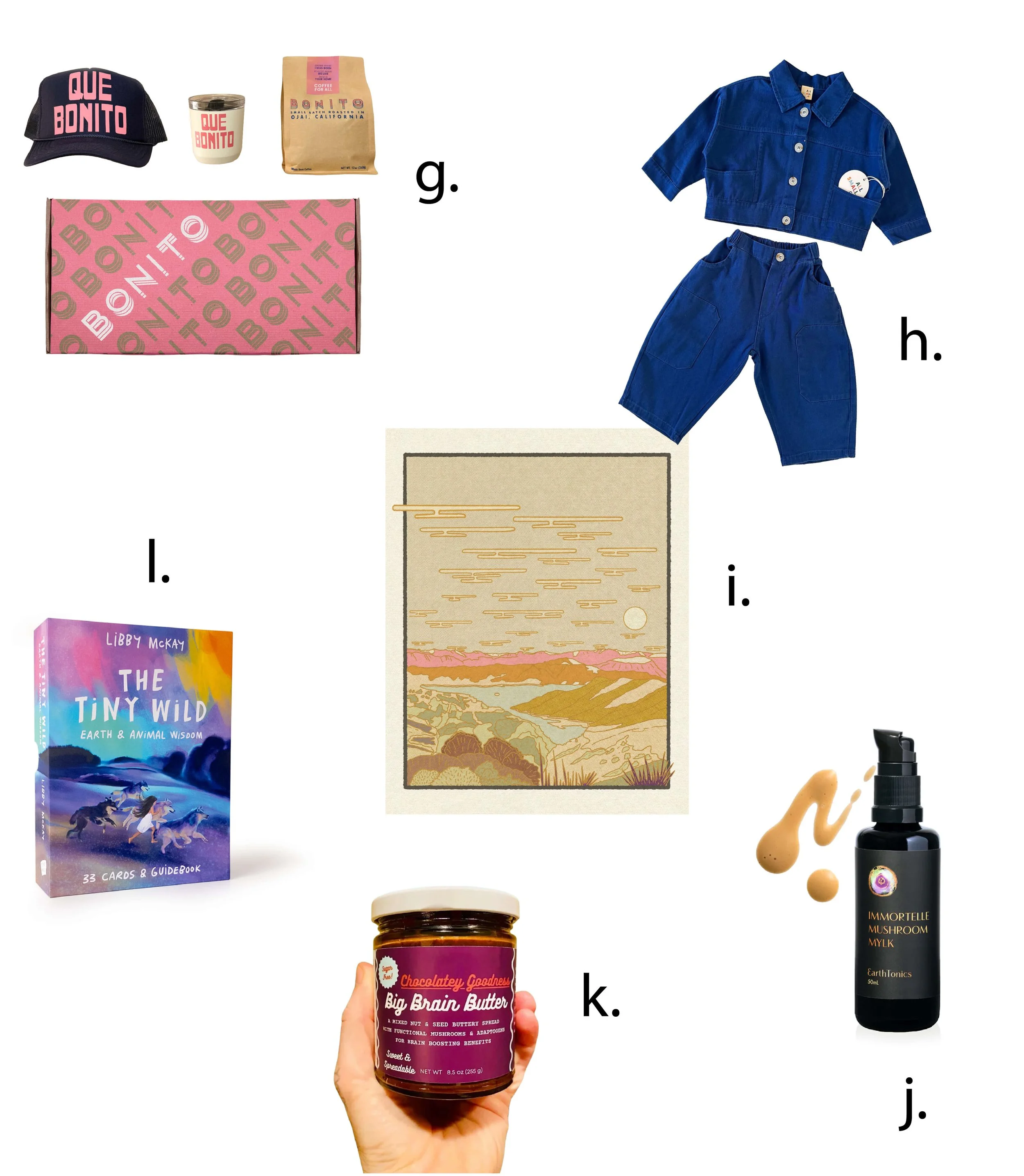 g. Gift Box. Bonito Coffee. $80. h. Blue Workwear Set. All Small Co. $72. i. “Save Lake Casitas” Print. Sunrise Via Lola. From $30. j. Immortelle Mushroom Mylk. Earth Tonics. 30 oz. $48. k. Big Brain Functional Mushroom Butter. Ohms Collective. $25. l. Kids’ Cards and Guidebook. The Tiny Wild. $35.