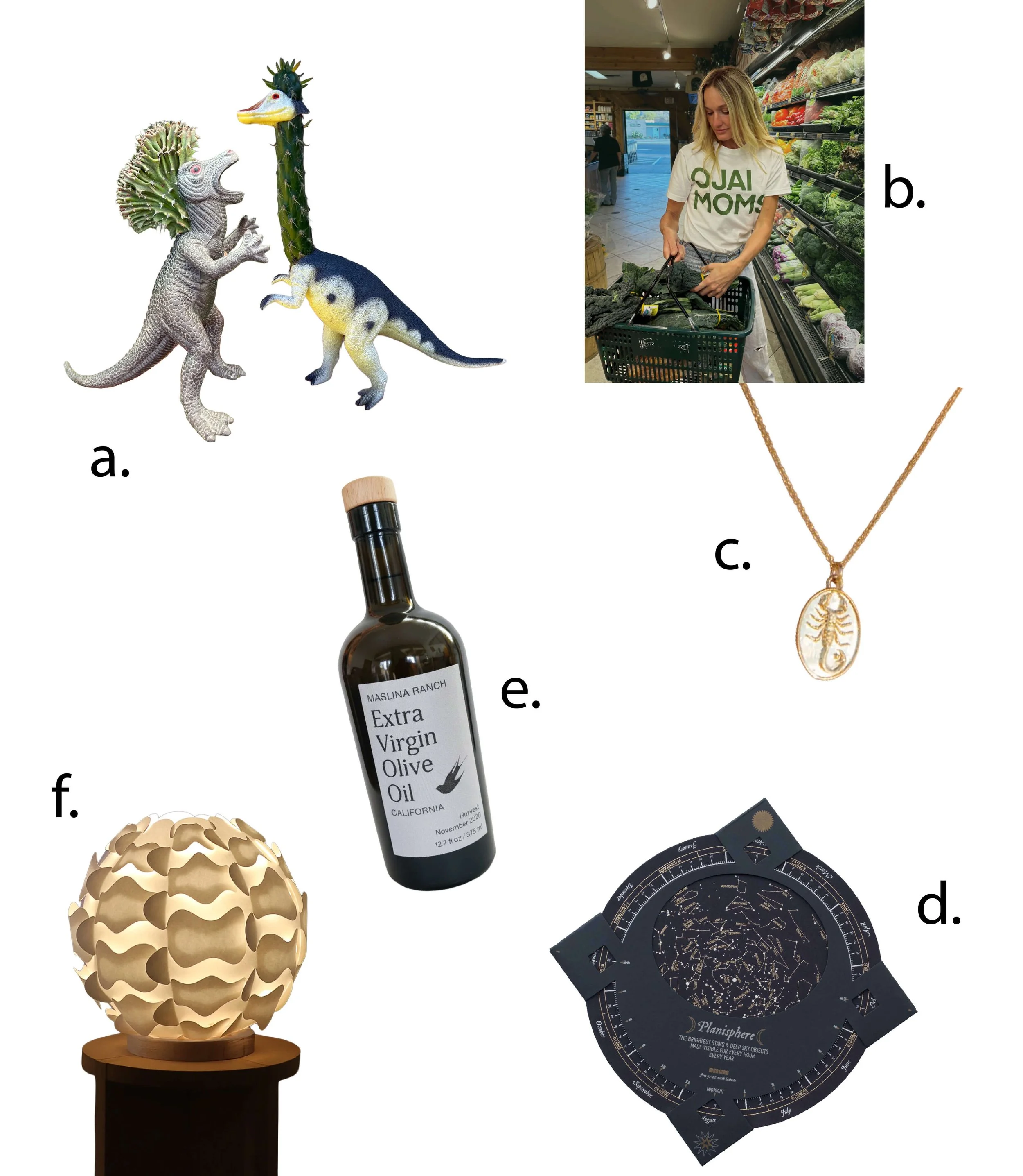 a. Succulent Dinosaur. Succulent Zoo. $20-125. b. Ojai Moms shirt. DM Small Time Citrus. $35.