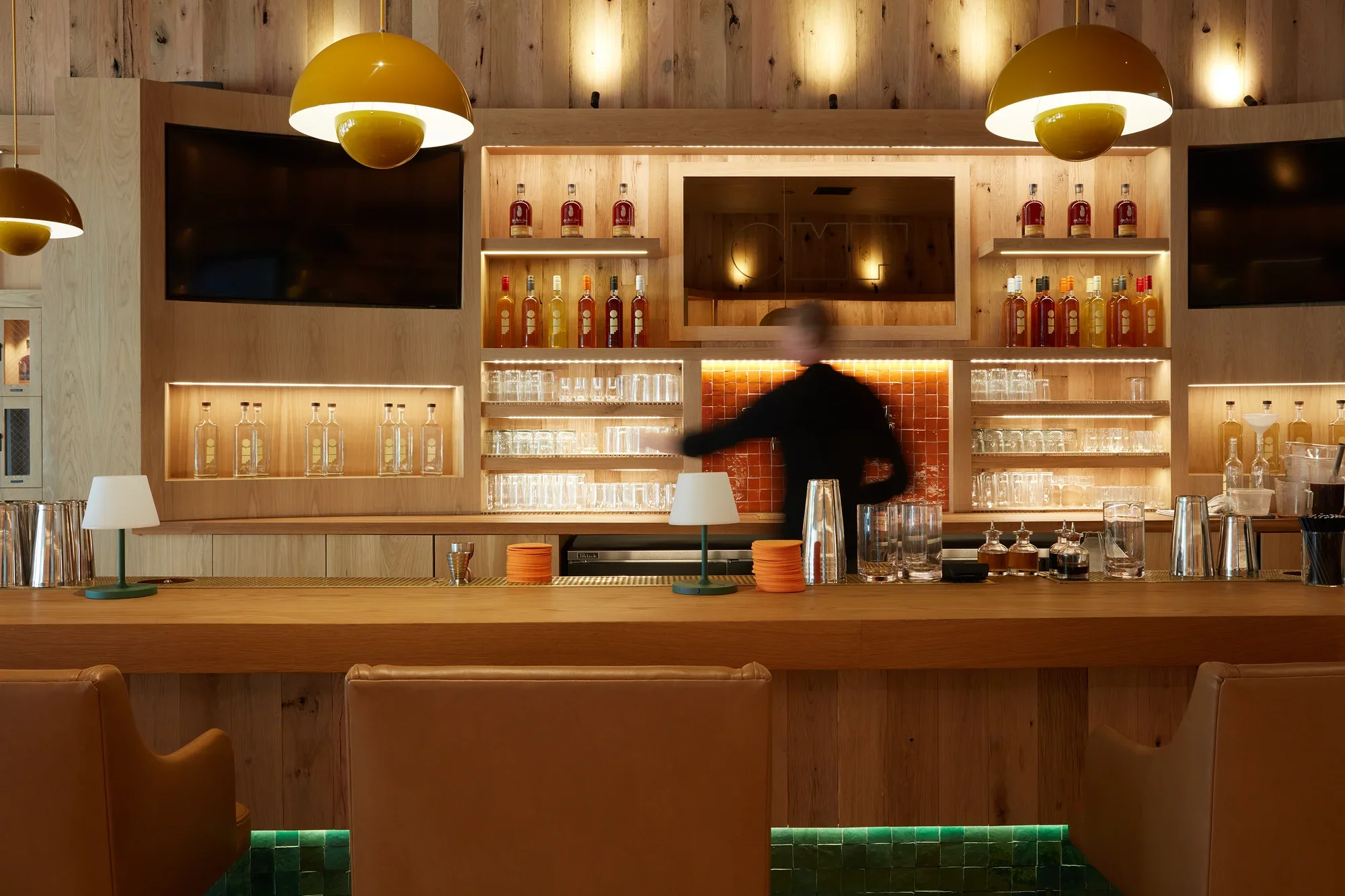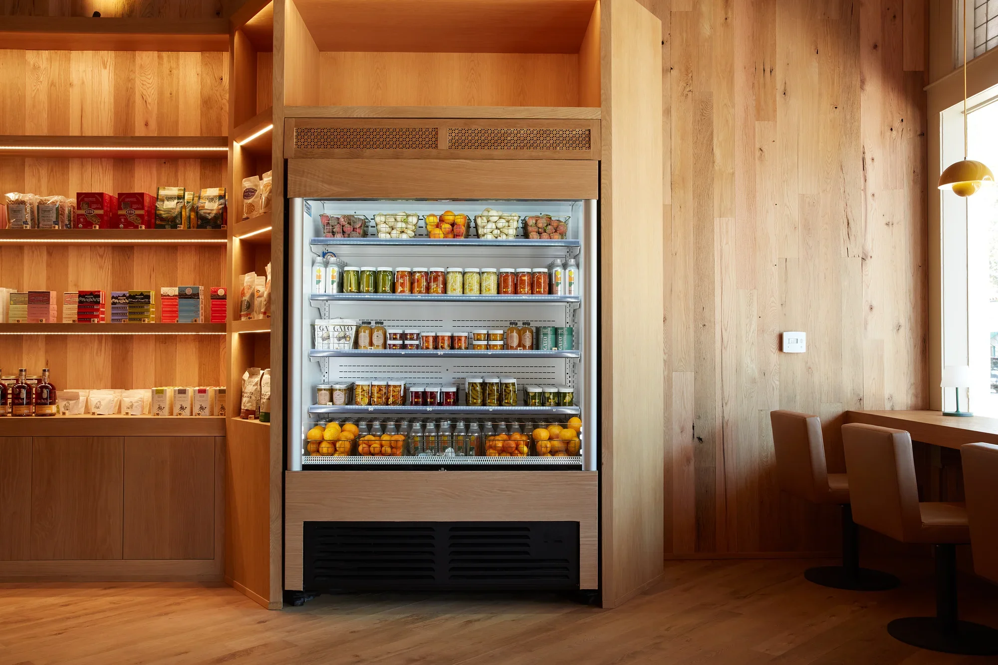 The space is unrecognizable. All natural oak, built out by local woodworker Logan Gould; light, clean, and warm. Seating runs along the large front windows so you can watch the Arcade traffic go by. Two lounge chairs sit before a wall of oak lockers reserved for Whiskey Club members. The oak doesn’t stop. Shelves, walls, and ceiling. The room feels almost carved from a single thing: the bar and deli counter to the left, the market shelves to the right.