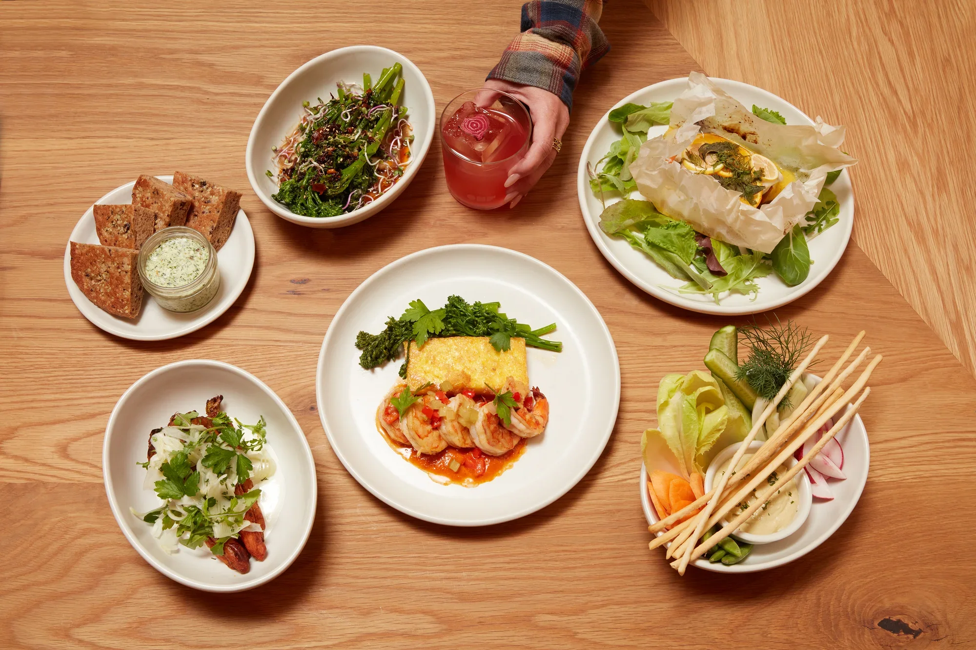 Then came the bread, soft and seedy: whole wheat flour, black beans, quinoa, and hemp seeds, a happy detour from the ubiquitous sourdough. Its spread is a compound herb mixture of goat butter, shallots, garlic, parsley, tarragon, thyme, lemon zest, orange zest, and salt. My husband, Nick, had ordered the Prawns and Polenta, which arrived as shrimp over a polenta cake made with goat milk and pecorino, with a pepper coulis and a ‘southern trinity’ of red bell pepper, celery, and onion, alongside broccolini. It was gone before I got to taste it. I didn’t even see it.