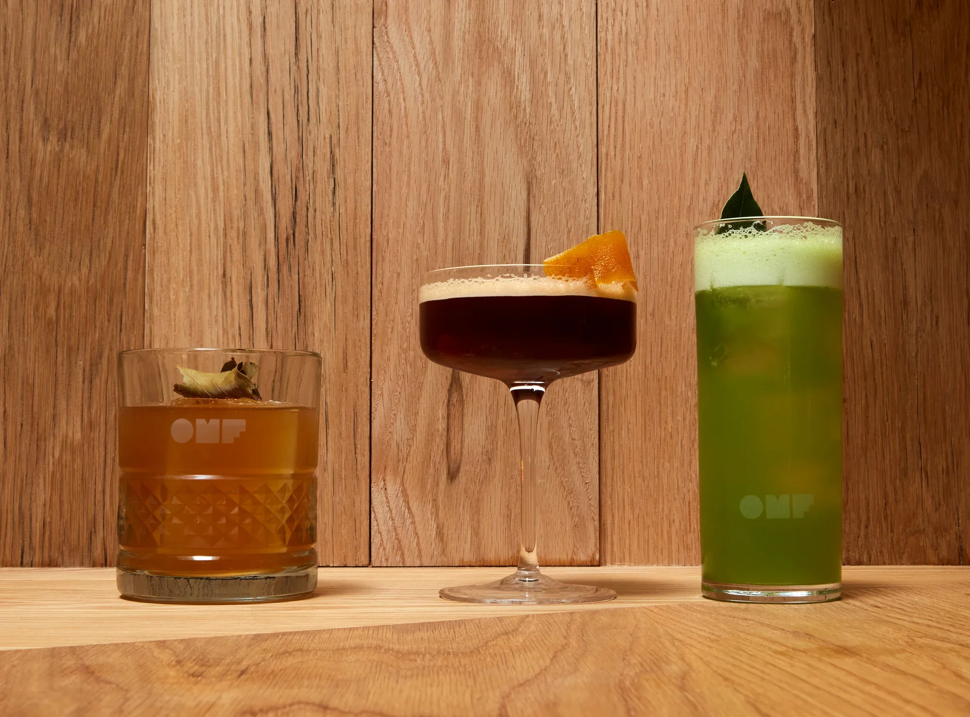 The OMF cocktail list is inventive. A Beets Negroni uses OMF gin, beet shrub, and sweet vermouth. A Cucumber Gin puts bay leaf-infused OMF gin with fresh-juiced cucumber, celery, lime, and soda. An Avocado Old Fashioned uses avocado leaf-infused OMF whiskey, avocado seed orgeat, and bitters. The Strawberry is OMF citrus vodka with rose hips, balsamic vinegar, and fresh lime, garnished with a dehydrated beet leaf. You can order a Coffee Martini made with OMF coffee liqueur. You cannot, Tony will tell you, order a Jack and Coke.
